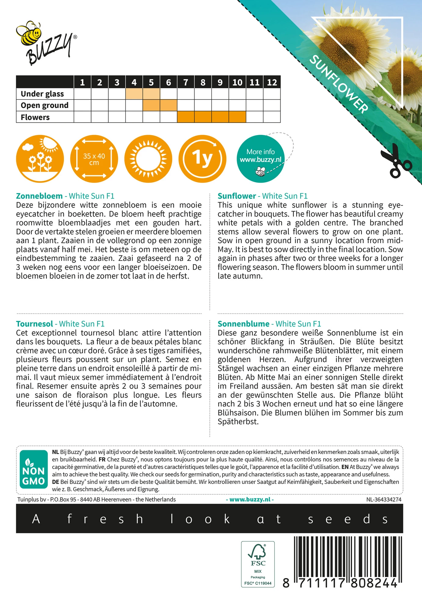 Diese ganz besondere weiße Sonnenblume ist ein schöner Blickfang in Sträußen. Die Blüte besitzt wunderschöne rahmweiße Blütenblätter, mit einem goldenen Herzen. Aufgrund ihrer verzweigten Stängel wachsen an einer einzigen Pflanze mehrere Blüten. Ab Mitte Mai an einer sonnigen Stelle direkt im Freiland aussäen. Am besten sät man sie direkt an der gewünschten Stelle aus. Die Pflanze blüht nach 2 bis 3 Wochen erneut und hat so eine längere Blühsaison. Die Blumen blühen im Sommer bis zum Spätherbst.